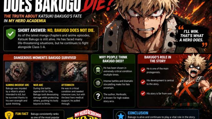 Fans of My Hero Academia often search one emotional question: does Bakugo die? As one of the most popular and explosive characters in the series, Bakugo has been at the center of many intense battles, shocking moments, and dramatic cliffhangers. Because of this, viewers constantly wonder if the story will permanently remove him from the action.