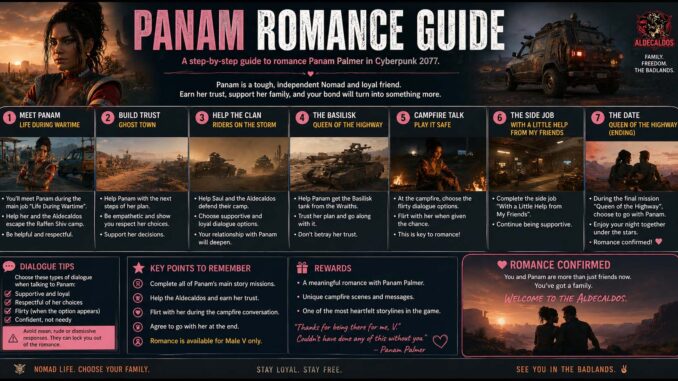 If you are searching for the best panam romance guide, you are in the right place. Panam Palmer is one of the most loved characters in Cyberpunk 2077, and many players want to know how to build a relationship with her. She is bold, loyal, and full of personality, making her one of the top romance options in the game. This guide explains everything you need to know to successfully romance Panam, make the right dialogue choices, and enjoy one of the most emotional storylines in Night City.